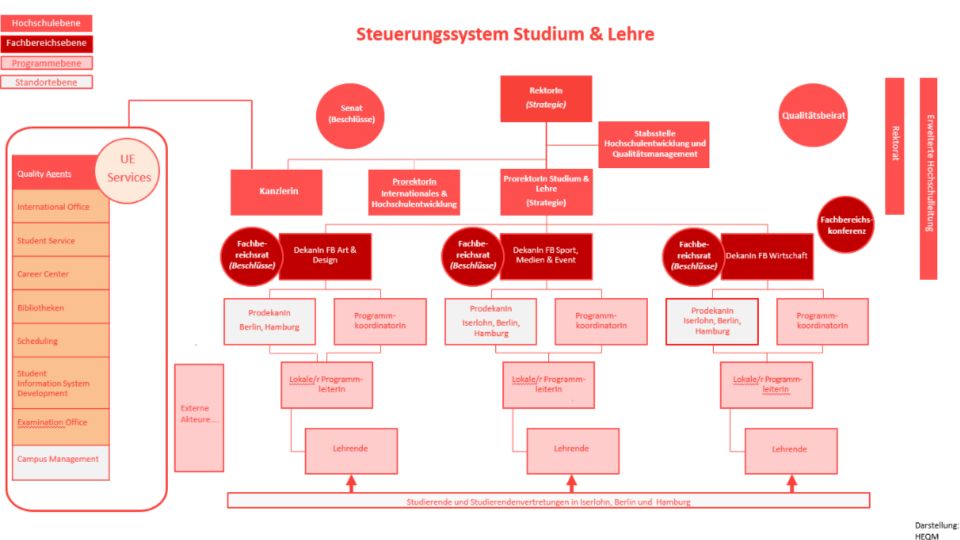In doing so, UE pursues the concept of a constantly improving and developing higher education institution with a focus on an innovative range of studies. Thus, UE does not only want to measure itself against (external) quality standards, but that it also works continuously on the development of quality in all university areas and pursues self-imposed goals for the quality of the university. This understanding of quality therefore adequately includes the perspective of the “university as an enterprise” in addition to the perspective of study and teaching, in order to be able to offer high-quality study programmes on a sustainable basis.