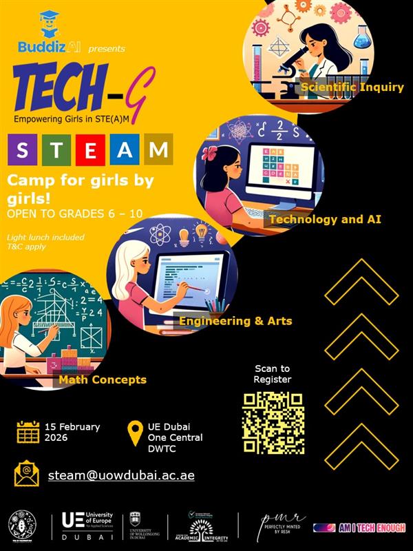 The University of Europe for Applied Sciences Dubai invites girls from UAE schools (Grades 6–10) to an inspiring one-day STEM Camp designed to spark creativity, confidence, and curiosity in science, technology, engineering, and mathematics.